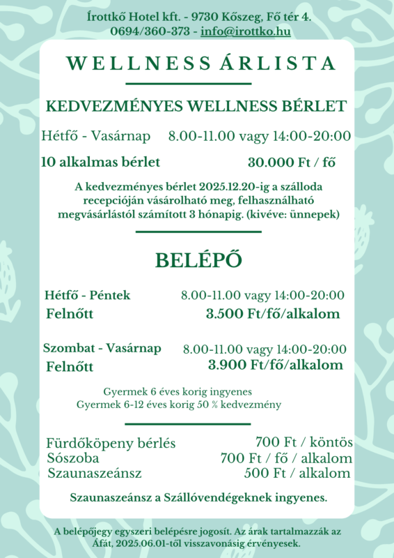 A kedvezményes bérlet 2025.12.21-ig a szálloda recepcióján vásárolható meg, felhasználható megvásárlástól számított 3 hónapig. (kivéve: ünnepek)