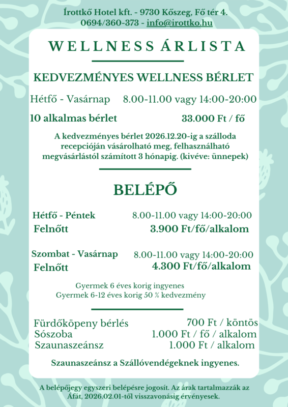 A kedvezményes bérlet 2026.12.20-ig a szálloda recepcióján vásárolható meg, felhasználható megvásárlástól számított 3 hónapig. (kivéve: ünnepek)